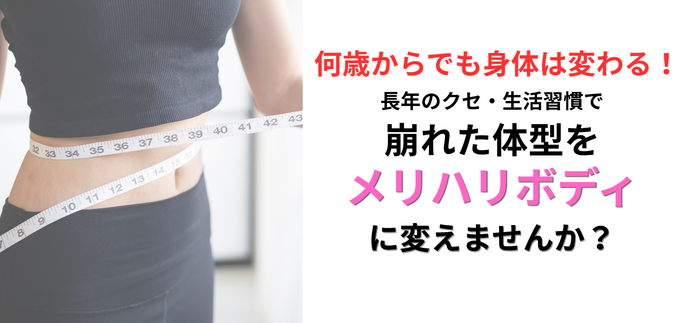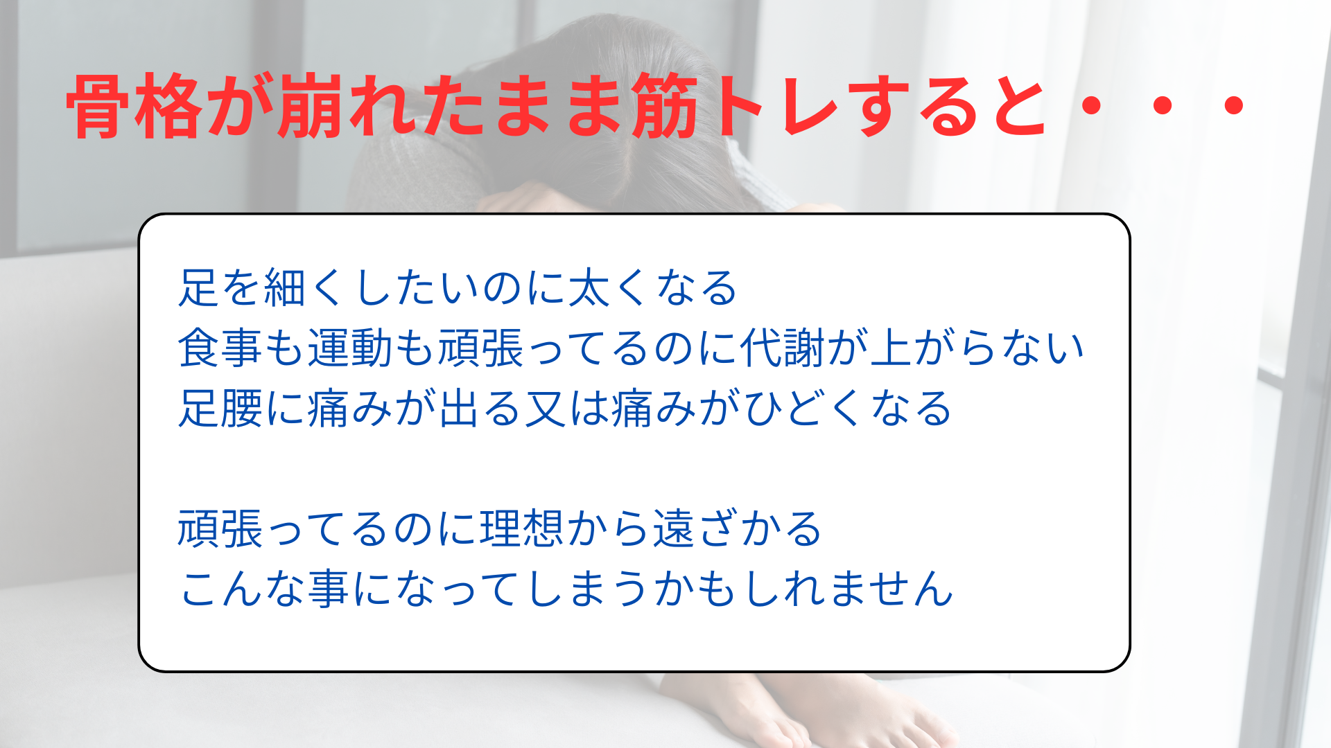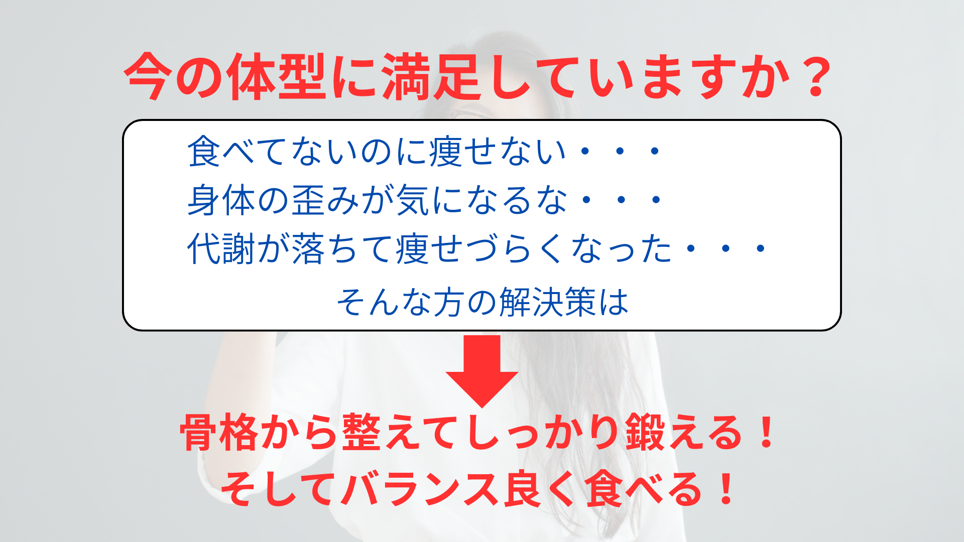 ダイエットやボディメイクの土台を変える『骨格ボディメイク』筋肉の前に骨格と動作を整えるためキツすぎず、しっかりと効果のあるトレーニングが可能です。