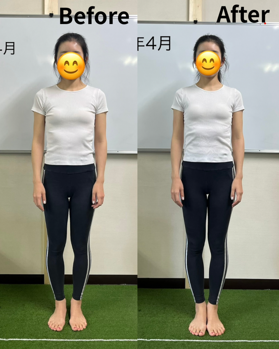 正面からのビフォーアフターを比べると、元々XO脚気味の脚がまっすぐになり、肩が開いて、首もスッキリしました✨